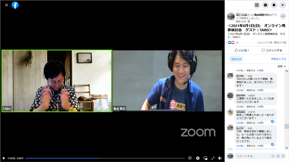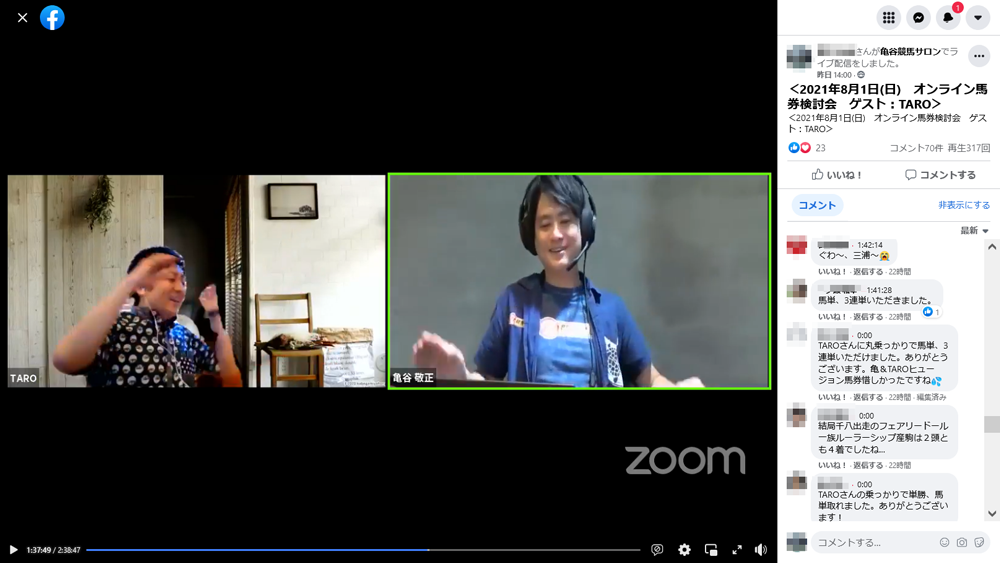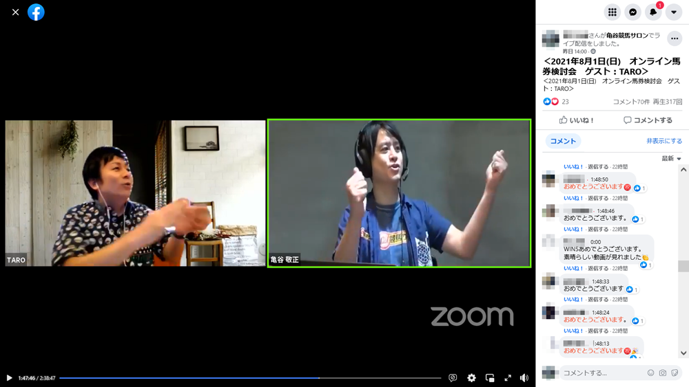毎週土日には亀谷とゲストのライブ配信も実施中。先週の日曜日には競馬予想家のTAROさんとリモートで馬券検討会を配信しました。