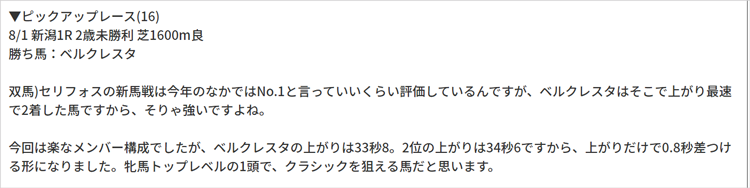 双馬さんのおっしゃる通り、2着のベルクレスタも次走で順当勝ち。その未勝利戦の評価の際にもこのように語っており、かなり高く評価していることが分かりますよね!