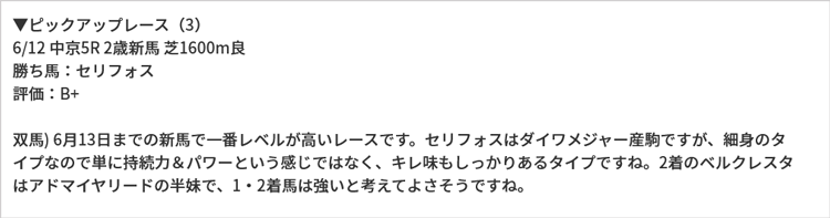 競馬予想家・双馬毅さんによるセリフォスの新馬戦評はコチラ(【第5回 無料公開】馬券特化型の2歳戦診断(6月5日~6月13日分)/双馬毅の“ローテ×血統”錬金術)でも語られています。