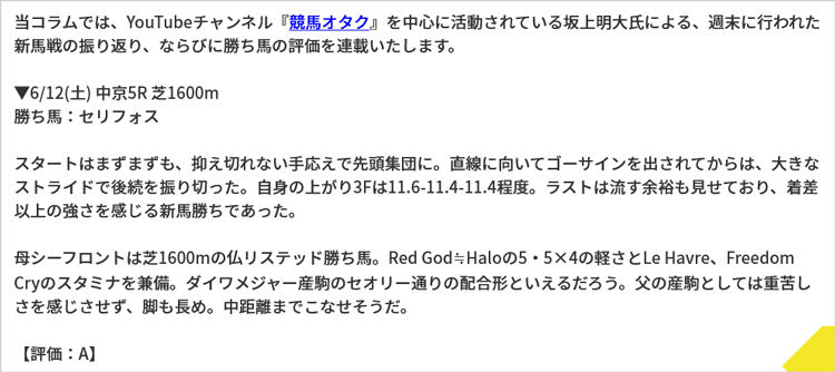 その他にも、YouTubeチャンネル『競馬オタク』を中心に活動されている坂上明大氏による、週末に行われた新馬戦の振り返り、ならびに勝ち馬の評価も連載中!(ハイアムズビーチなど6月12日(土)~13日(日)デビュー馬評価/競馬オタク・坂上明大の新馬戦チェック!)