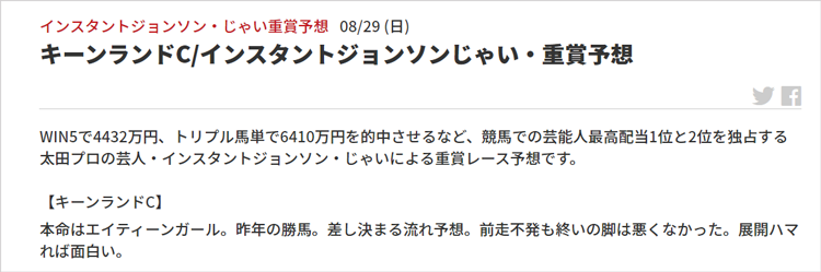 さらに亀谷サロンのみならず、競馬ファンの皆様にはお馴染みのインスタントジョンソン・じゃいさんの予想コラムも大好評連載中!こちらは人気薄(7人気)ながら2着に好走したエイティーンガールを本命推奨。お見事でした!